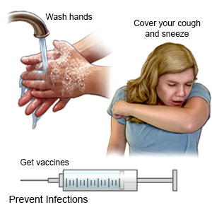 Remind your child to cover a sneeze or cough. Show your child how to use a tissue to cover his or her mouth and nose. Have your child throw the tissue away in a trash can right away. Then your child should wash his or her hands well or use a hand sanitizer. Show your child how to use the bend of his or her arm if a tissue is not available.